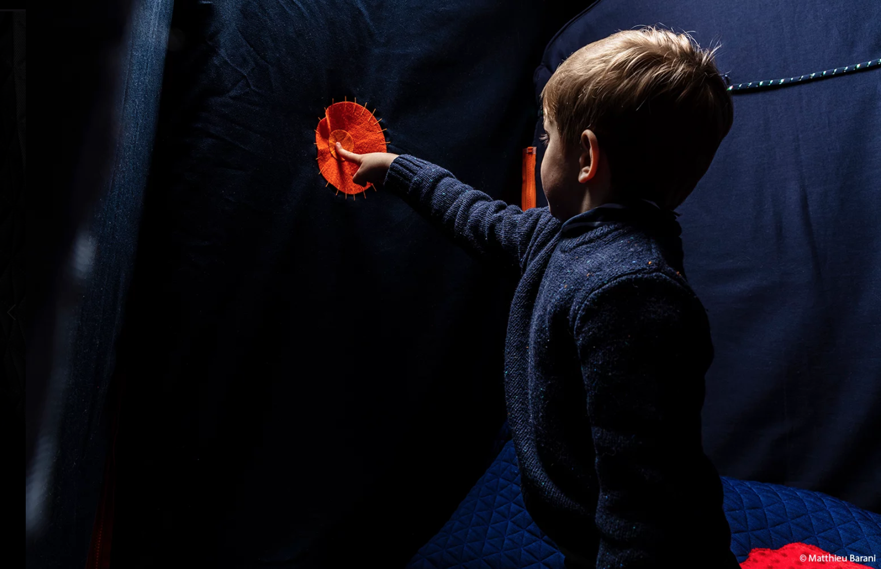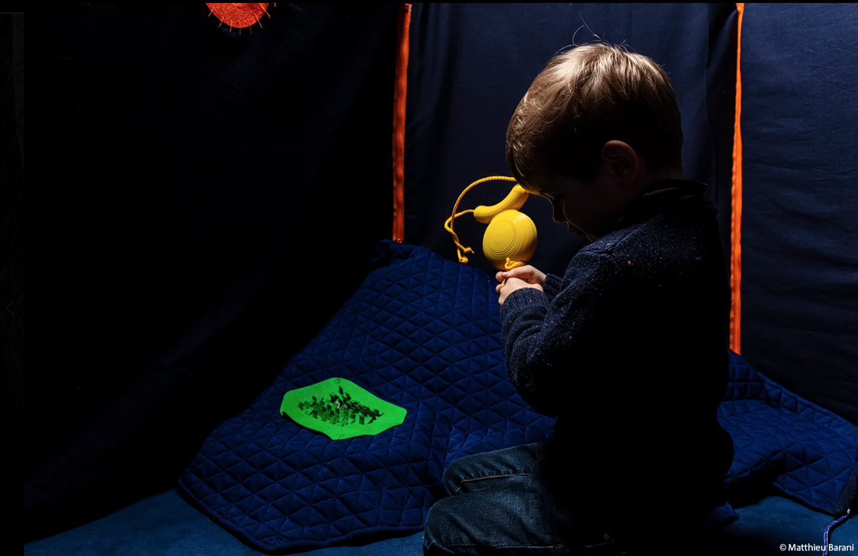The egloo is an interactive, digital and tangible space for toddlers. Following a story narrated by a storyteller, children are invited to explore the egloo and interact with various devices, such as a green spot that giggles when tickled, an object that plays music in rhythm, or a woven heart that beats when the child’s cheek is placed on it. Here, there’s no screen but digital technology, and the interactions offered to children are tangible and multi-sensory.